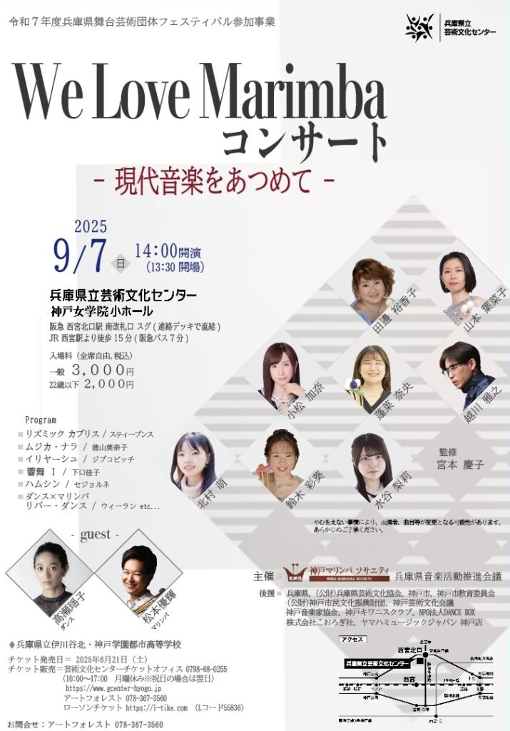 We Love Marimba 公開済み: 2025年9月6日更新: 2025年9月6日作成者: kobemarimbaカテゴリー: コンサート情報 9月に入りまだ残暑の厳しい日々、皆様お変わりありませんか。 さて、兵庫県立芸術文化センターでのコンサート、 いよいよとなりました。 現代音楽をあつめて と、いつもと違うチャレンジをさせて頂くコンサート。 監修・宮本慶子の元、メンバーそれぞれに真摯に取り組んで参りました。 お時ございましたら是非お越しいただけますと幸いです。 関連記事 30 コンサート情報 今年は例年以上に暑い日が続いておりますが、皆様いかがお過ごしでしょうか。 さて、コンサートのお知らせです。 ・2023年9月9日(土) ・15:00開演(14:30開場) ・We Love Marimbaコンサート〜マリ […] 公開済み: 2023年7月30日更新: 2023年8月3日作成者: kobemarimbaカテゴリー: コンサート情報 15 ソサエティ発表会 春の心地よい日々が続いております。 新入生、新社会人の皆さま、おめでとうございます。新年度も2週間が経ちましたが、いかがお過ごしでしょうか。 神戸マリンバソサエティは年度末に「六アイMUSIC FESTIVAL」、「音楽 […] 公開済み: 2024年4月15日更新: 2024年4月15日作成者: kobemarimbaカテゴリー: コンサート情報 30 夏にむけて! 早くも夏のような日が続いておりますが、皆様元気でお過ごしでしょうか。 去る4月26日、27日には、出演約100名のマリンバ発表会が、今年も無事に終了いたしました。 初めての開催になる、一般の部には高齢の方もたくさん出演者 […] 公開済み: 2025年5月30日更新: 2025年5月30日作成者: kobemarimbaカテゴリー: コンサート情報